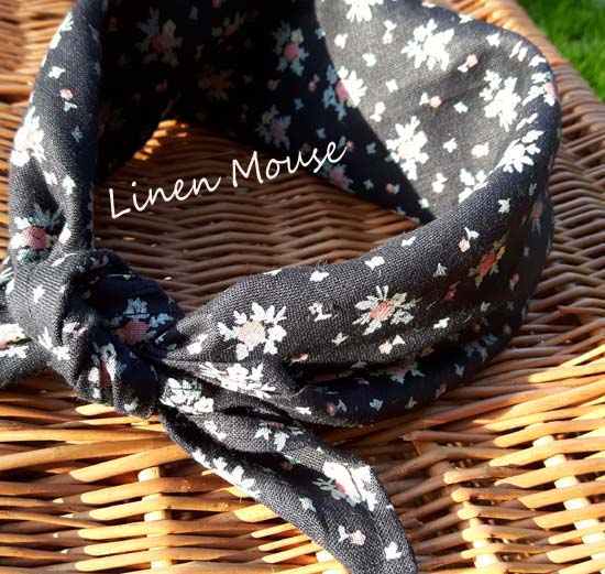 Bandana lniana w drobne kwiatuszki różowe, kremowe i błękitne.